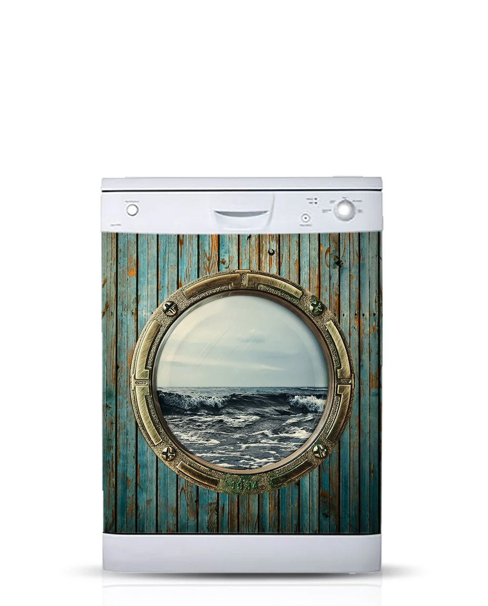 Like the view from the deck of a ship, this full fridge magnet is a window to the sea that you can have in your kitchen. The blue paint over the flaky wood gives you a feeling of grueling adventure, much like domestic life itself can be, sometimes.