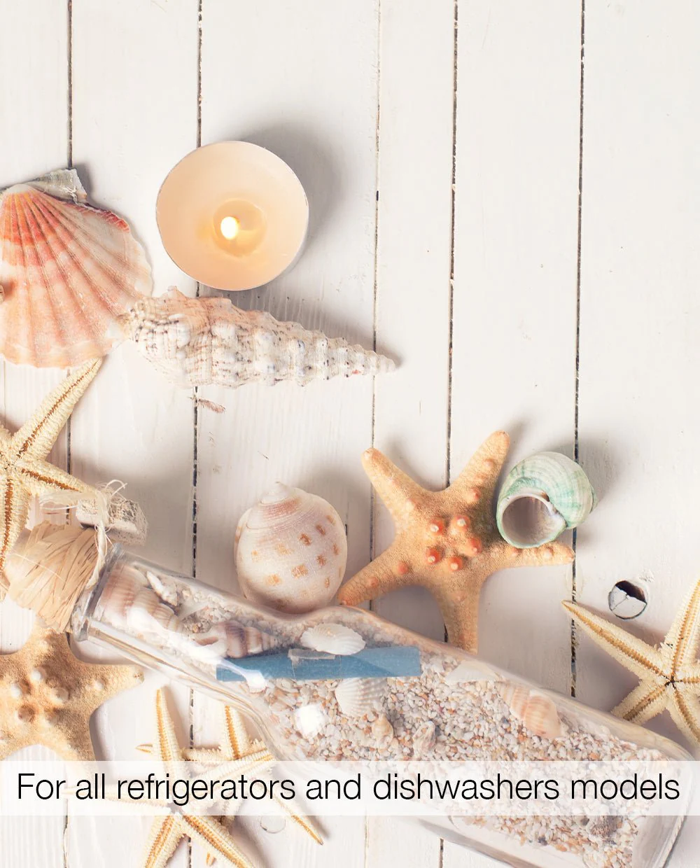 Look at all the souvenirs we kept from our trip to the beach! We got seashells, conches, and starfishes… And then we put them over white wood in this full fridge magnet, for your delight. A gleam of sea and sun on your kitchen.